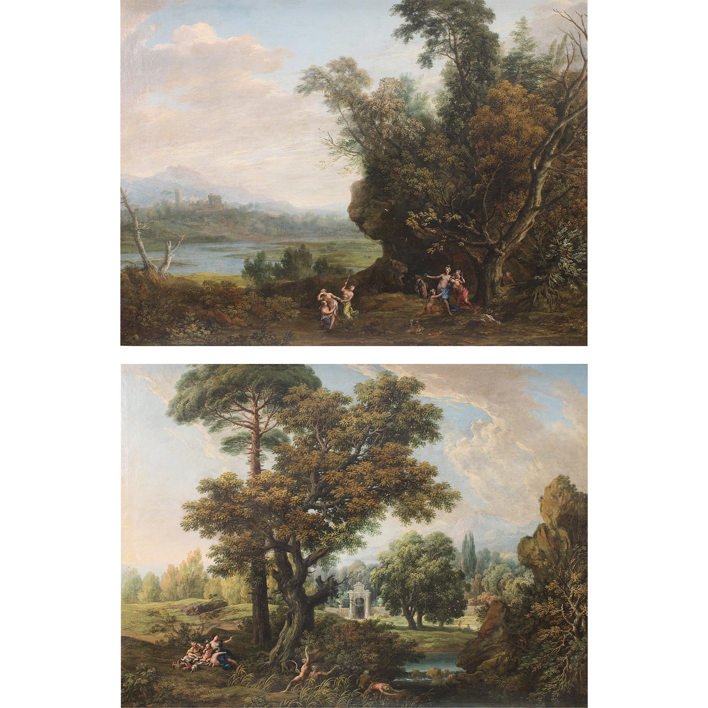 coppia di oli su tela raffiguranti paesaggi con figure e personaggi antropomorfi
