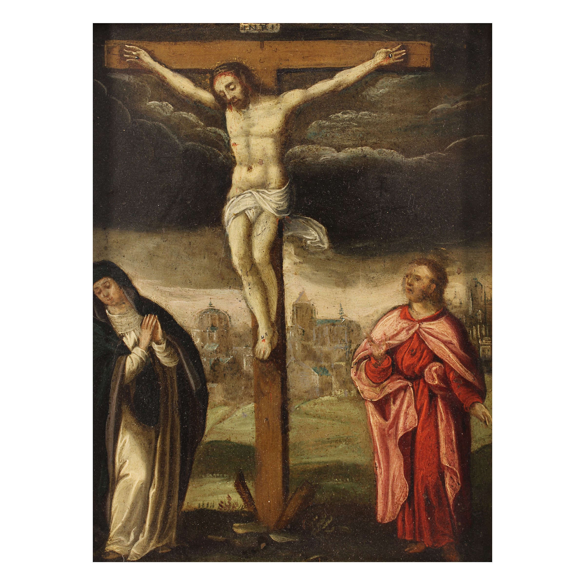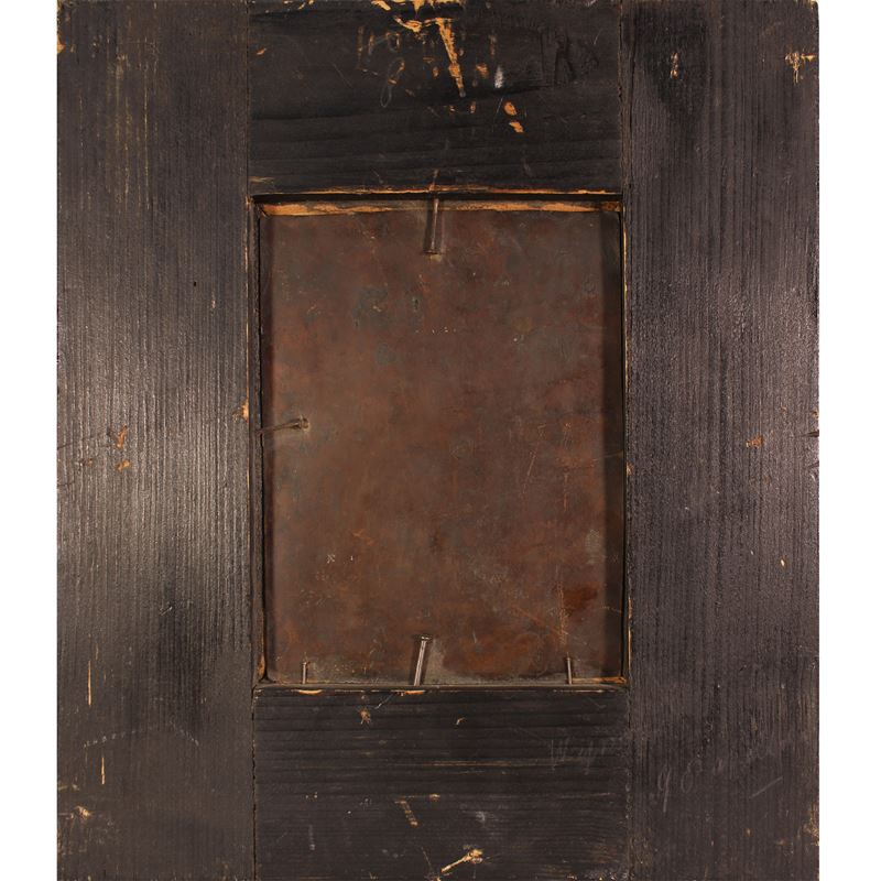 "Crocifissione di Cristo con la Vergine Maria e San Giovanni Evangelista" , olio su rame, entro cornice
