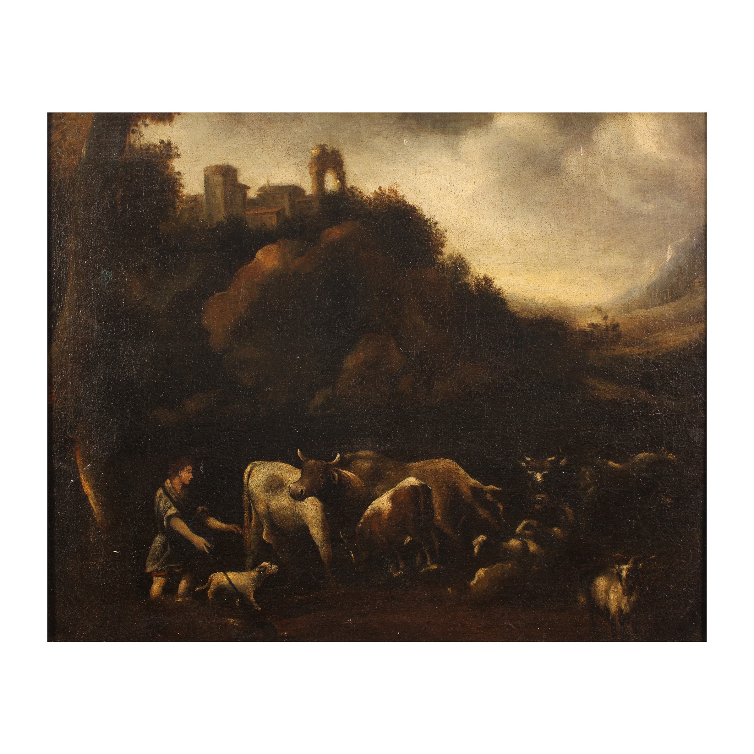 "Paesaggio con armenti e rovine", olio su tela.