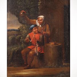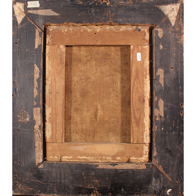 "Scena di genere", olio su tela, entro cornice in legno laccato e dorato, difetti.