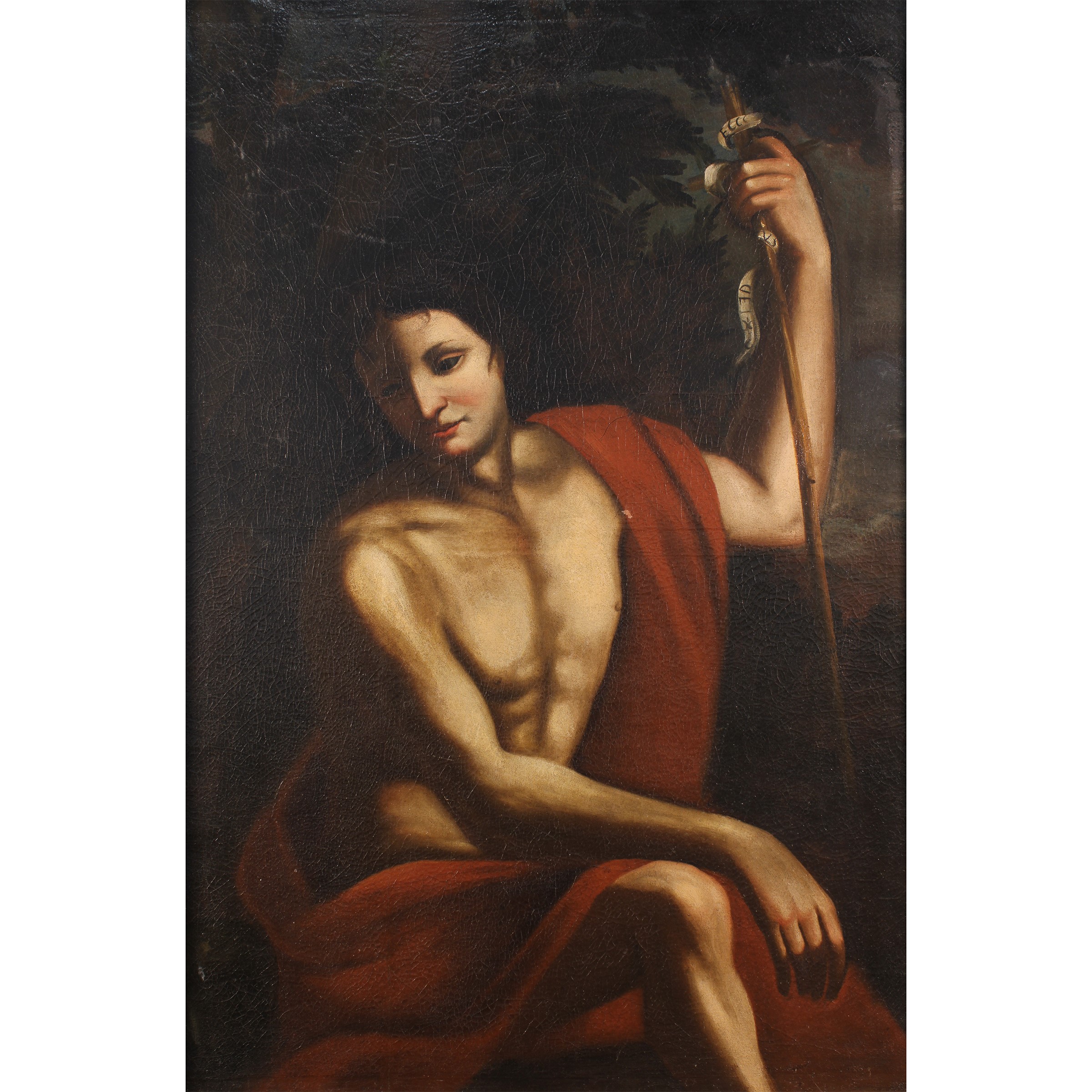 "San Giovanni Battista nel deserto", olio su tela, entro cornice in legno laccato a simulare il marmo