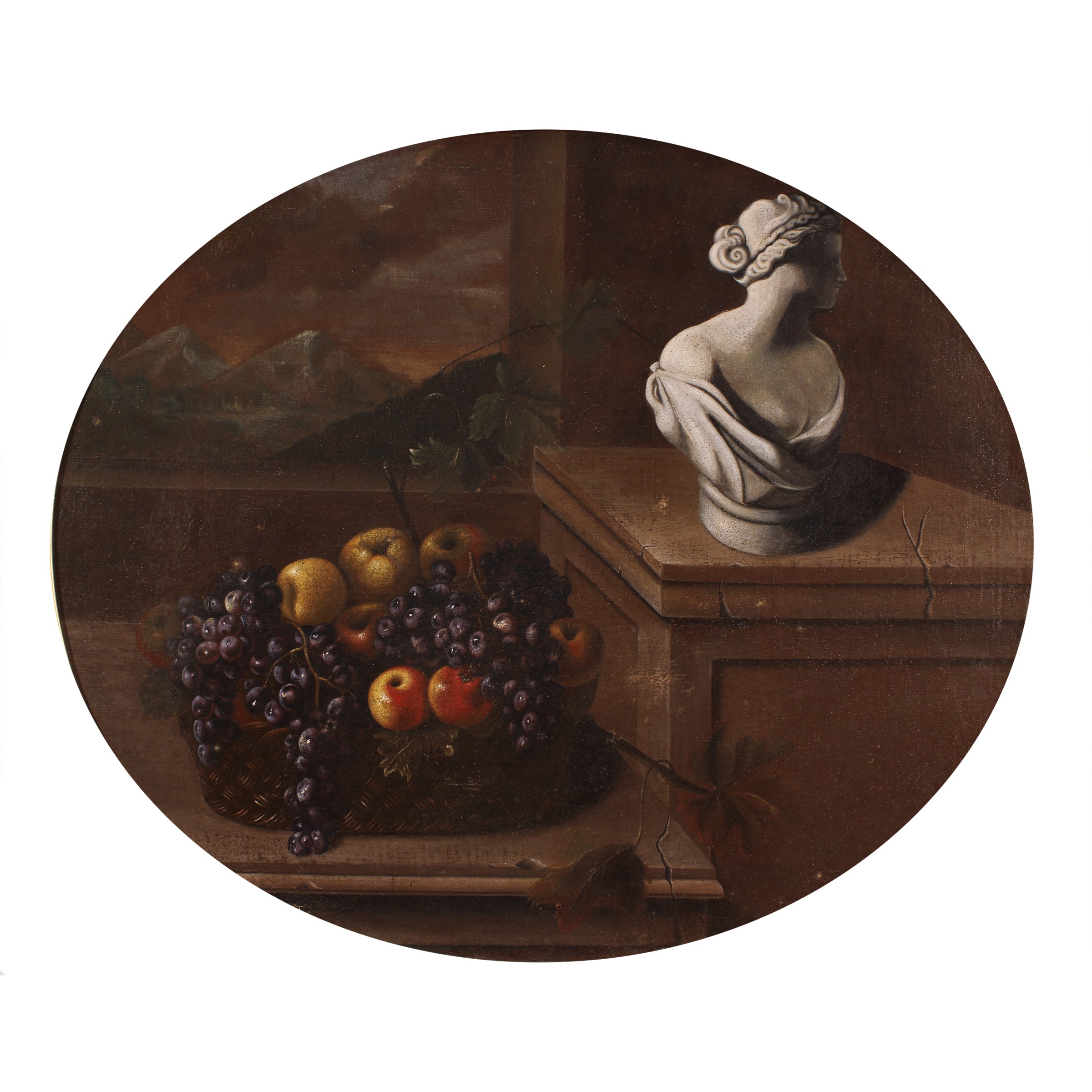 "Natura morta con frutta, busto e paesaggio", olio su tela, entro cornice