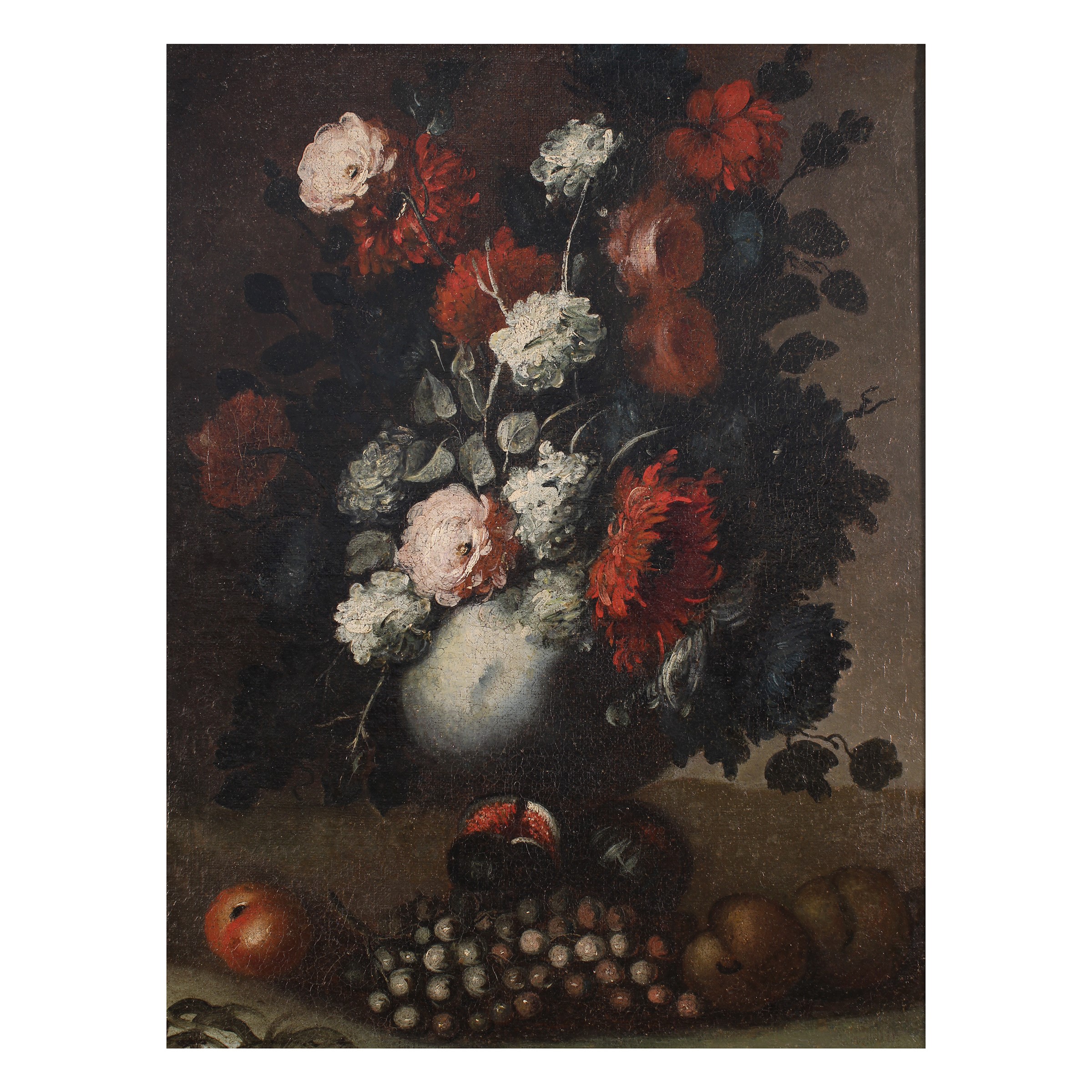 "Natura morta di fiori e frutta", olio su tela, entro cornice