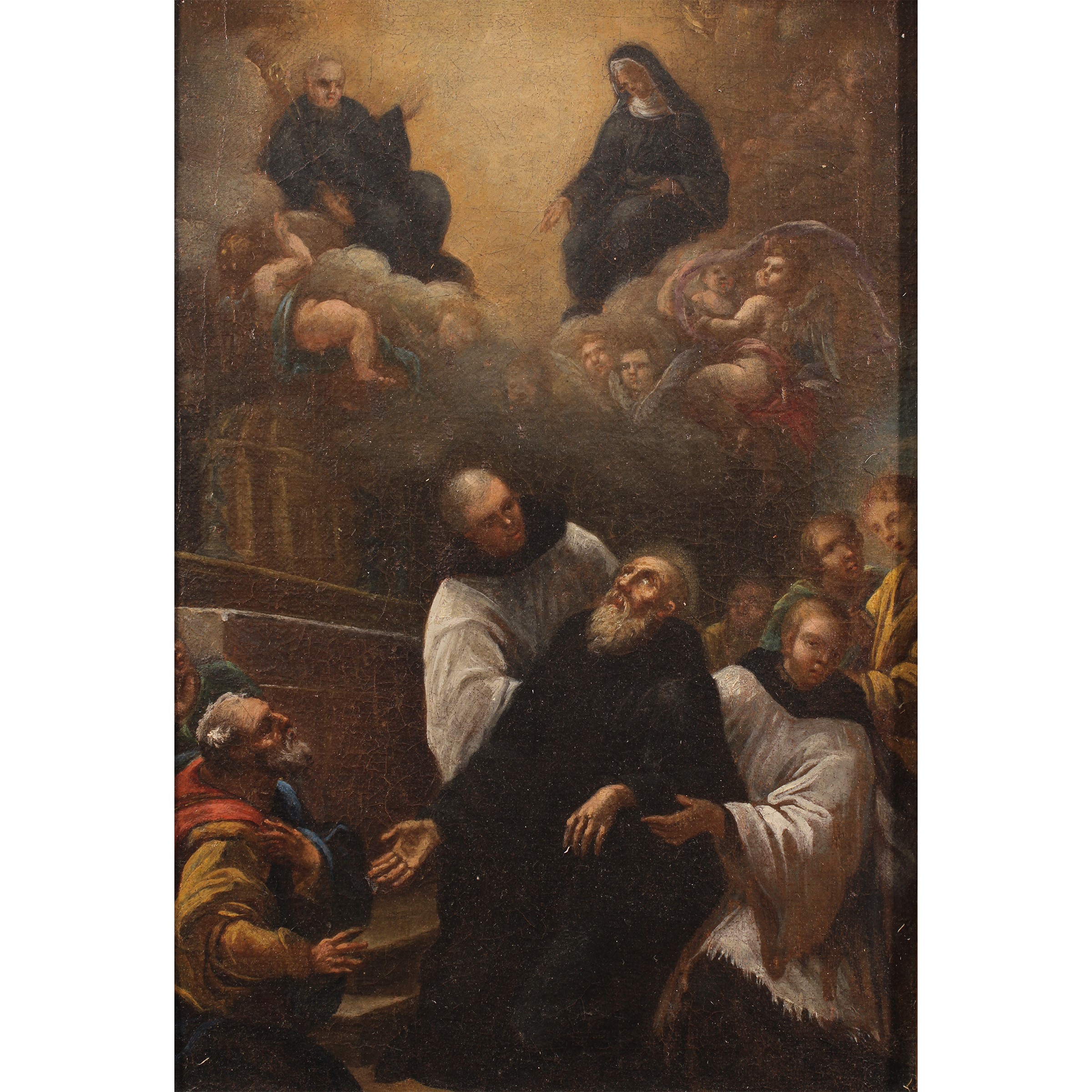 "La visione del Beato Domenico da Soriano. ", olio su tela entro cornice in legno con difetti.
