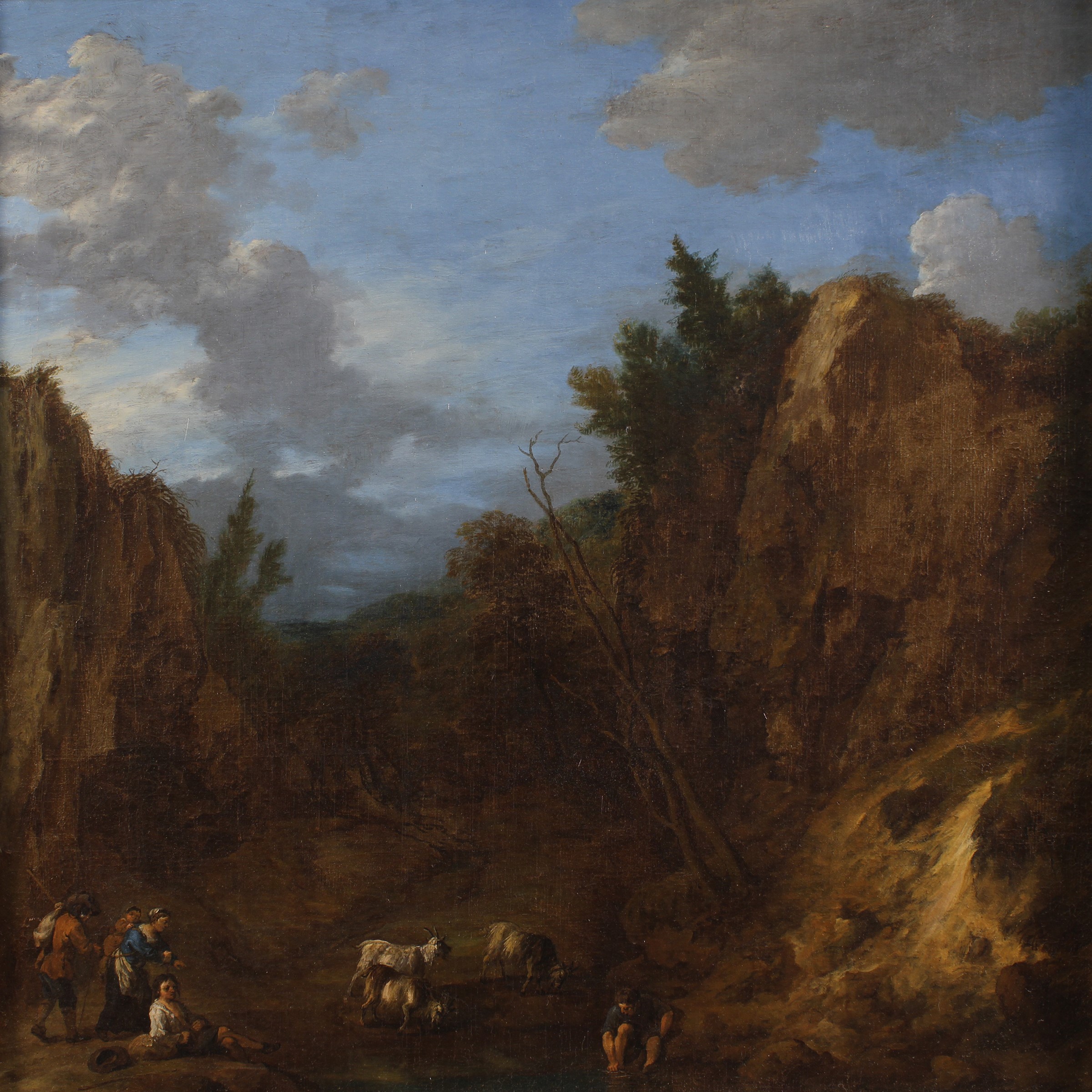"Paesaggio con armenti", olio su tela, entro cornice in legno dorato.