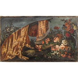 "Natura morta di fiori con drappeggio", olio su tela, entro cornice