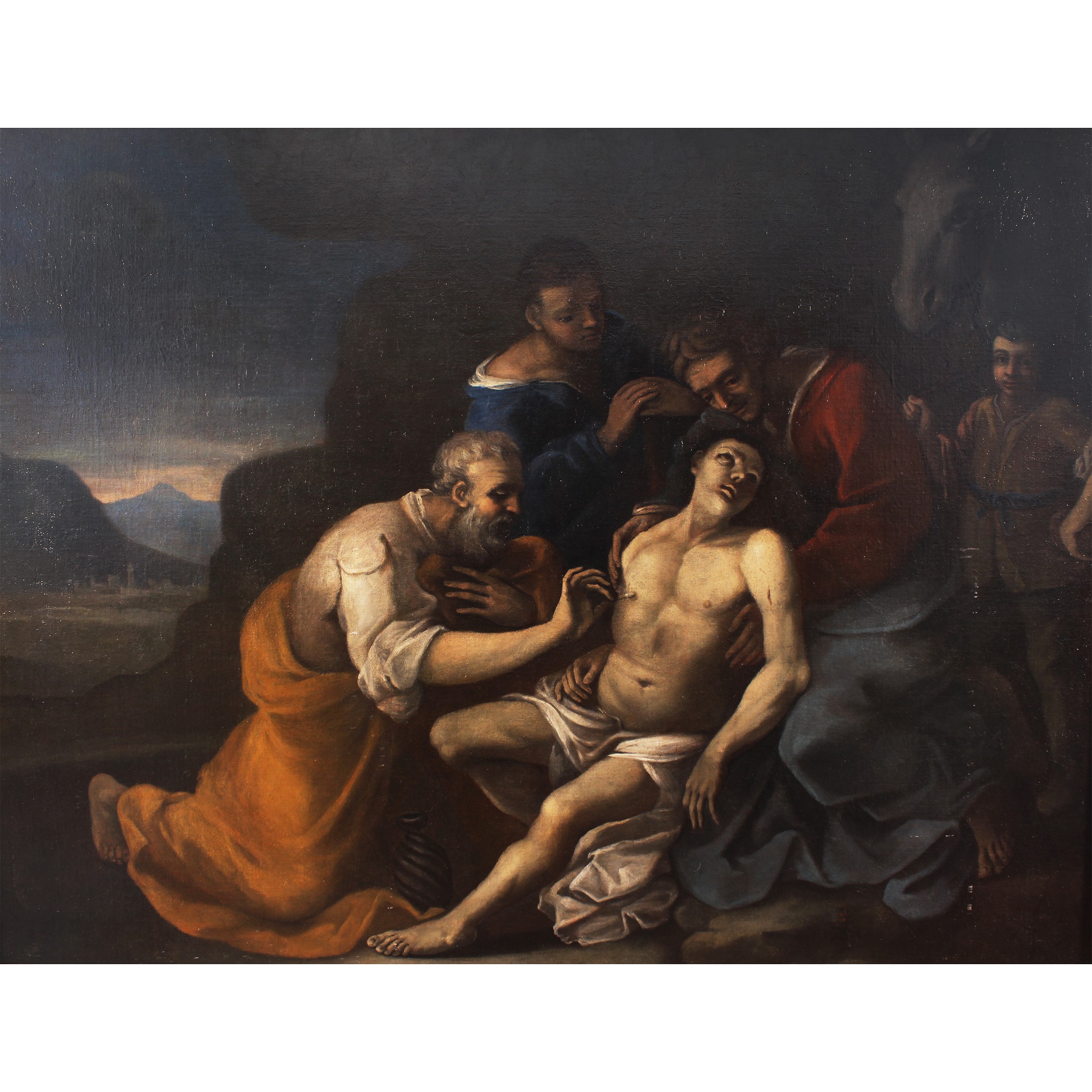 "Il Buon Samaritano", olio su tela, entro cornice in legno laccato e dorato.