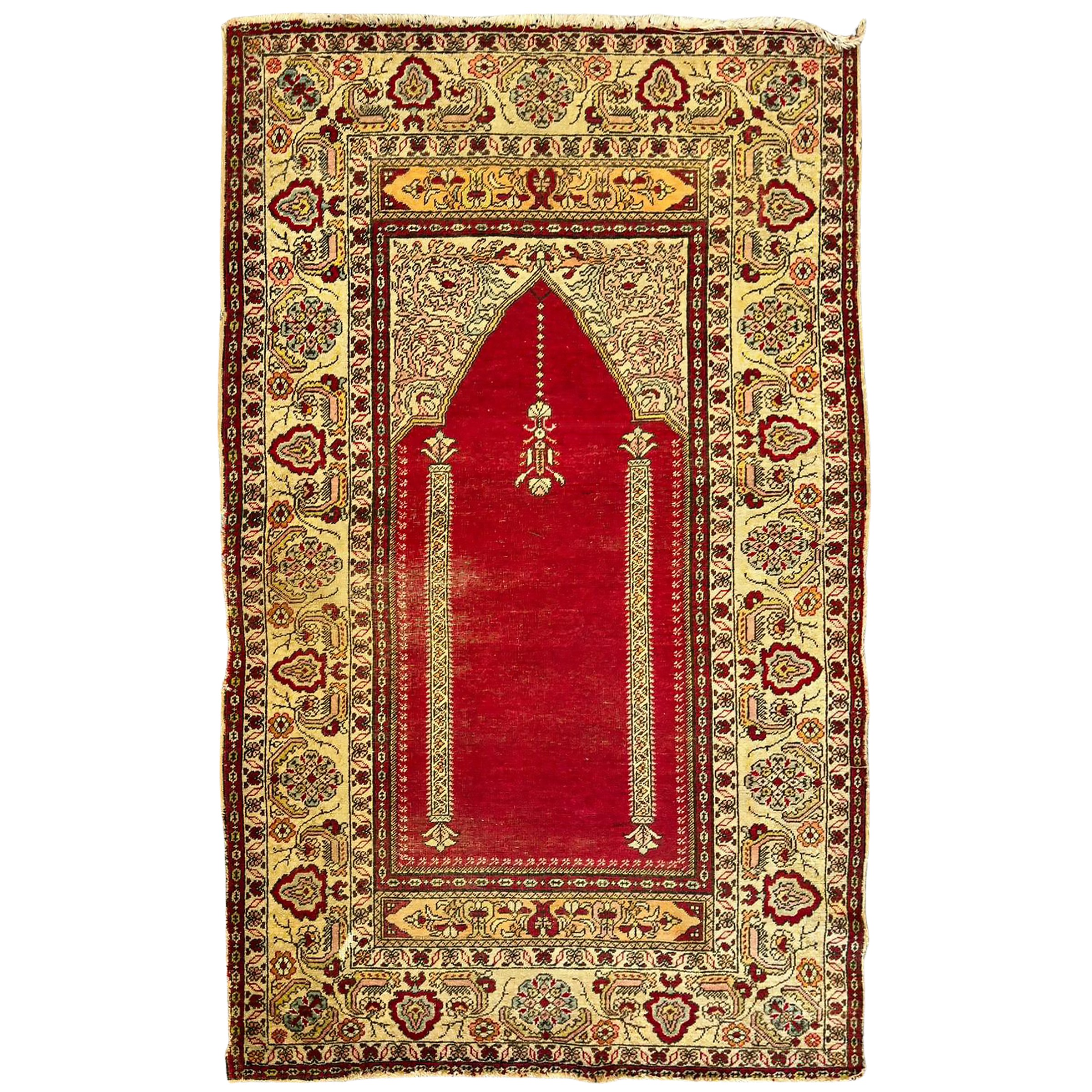 decorato con motivi floreali e vegetali su fondo rosso e giallo, usure.