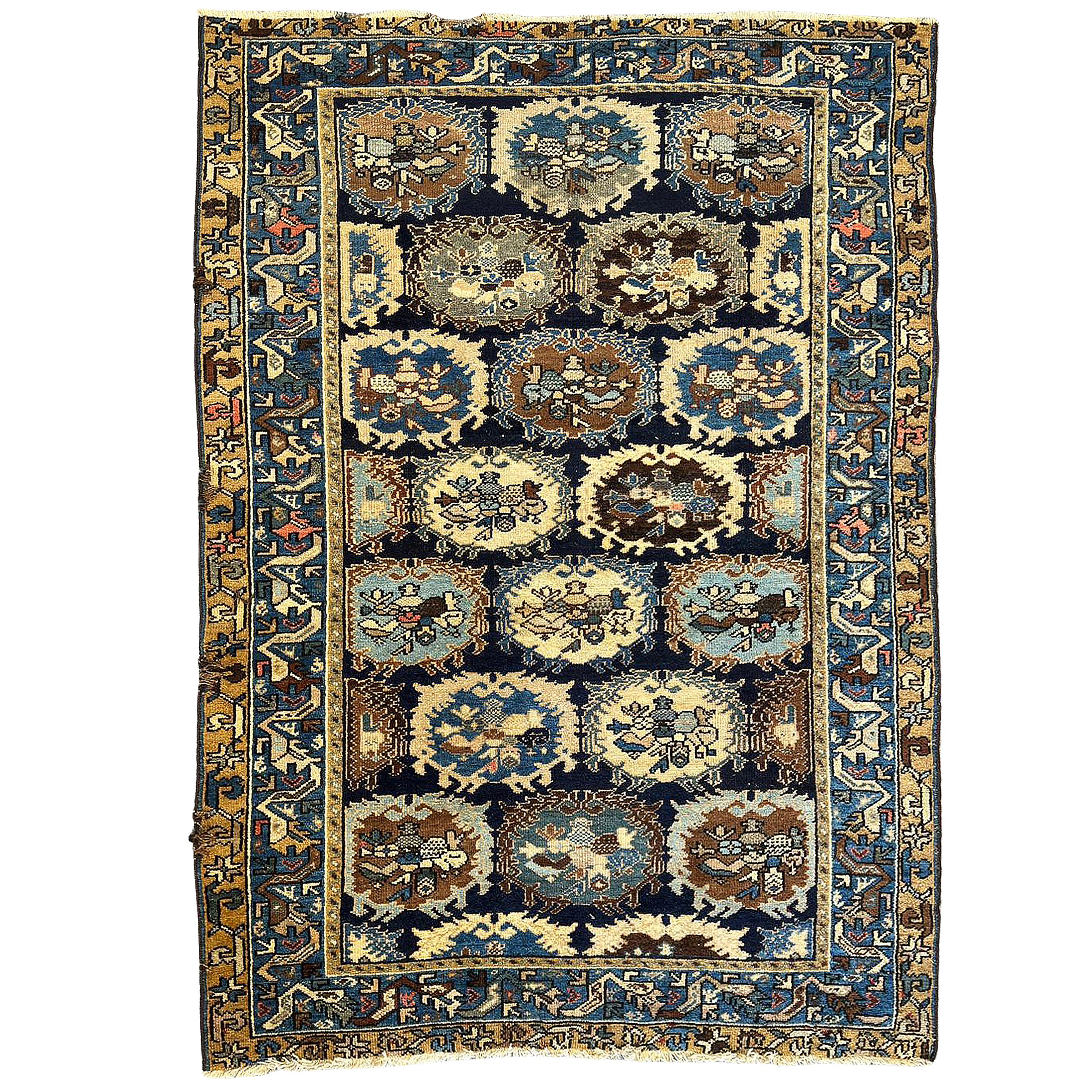 decorato con motivi geometrici floreali e vegetali su fondo blu, difetti e usure.
